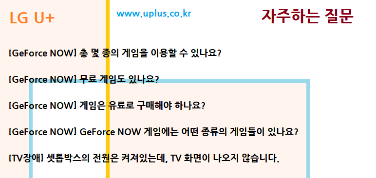 이용할 수 있는 게임 목록은 LG유플러스 홈페이지 [상품 서비스> 인터넷 서비스 보기> 인터넷 부가서비스> GeForce NOW] 메뉴에서 확인할 수 있습니다.